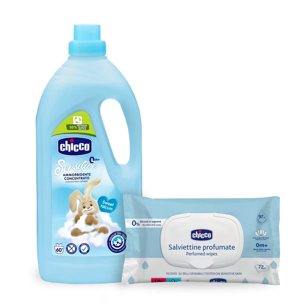 Chicco Koncentrált Öblítő Édes Púder 1.5L 60 Mosás + Nedves Törlőkendő 72db Ingyen - Kíméletes Baba Ruhatisztításhoz és Friss Illathoz