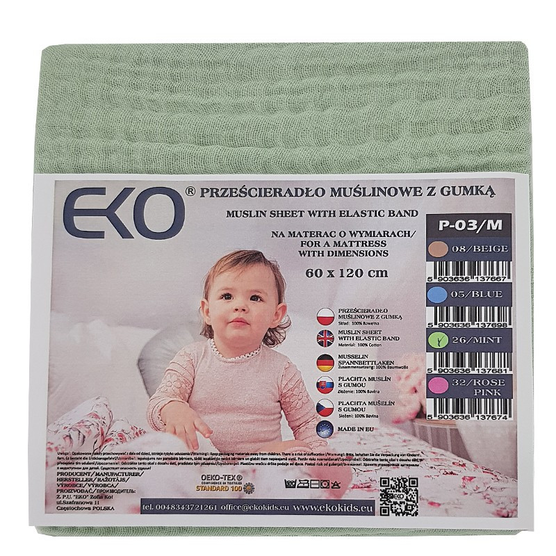 Az EKO muszlin feszítőlepedő mentol színben ideális választás kiságyba, ha fontos a baba kényelme, a természetes anyaghasználat és a biztonságos illeszkedés. A lepedő kiváló minőségű, nyomtatott 100% pamut muszlinból készült, amely finom kidolgozásáról és rendkívüli puhaságáról ismert. A muszlin anyag elasztán hozzáadása nélkül is rugalmasabb, mint a hagyományos pamut, így még kényelmesebb fekvőfelületet biztosít a babának.