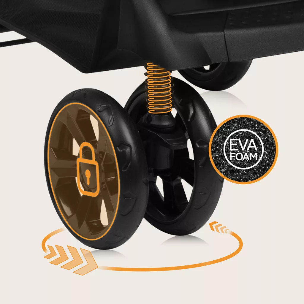 • Karbantartásmentes habkerekek: Az EVA habból készült kerekek hosszú élettartamúak, defektmentesek és nem igényelnek pumpálást. Az első kerekek ütéscsillapítással és kanyarodás blokkolással rendelkeznek, ami megkönnyíti a haladást és a baba ringatását.