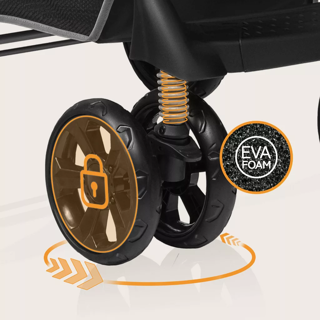 • Defektmentes EVA habkerekek: A kerekek karbantartásmentesek, nem igényelnek pumpálást, és hosszú élettartamot garantálnak. Az első kerekek ütéscsillapítással és kanyarodás-blokkolóval (fixálási lehetőséggel) rendelkeznek, ami segíti a ringatást elalváskor.