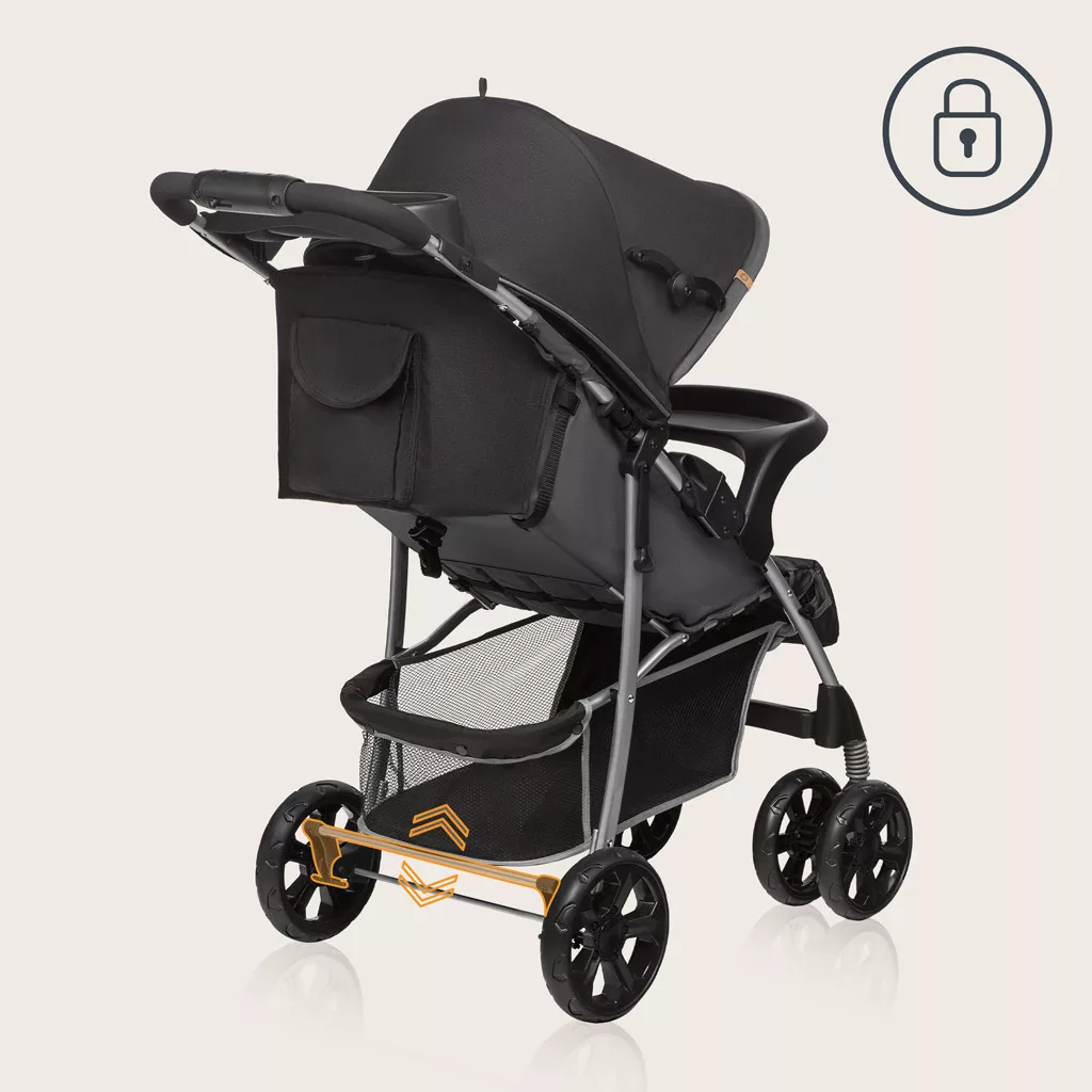 • Egykezes összecsukás: A váz egyetlen mozdulattal laposra hajtható, ami jelentősen megkönnyíti a közlekedést, ha éppen a gyermek is a karunkban van.