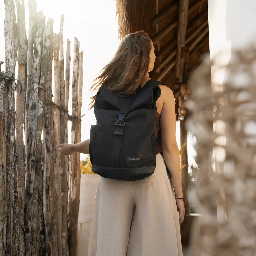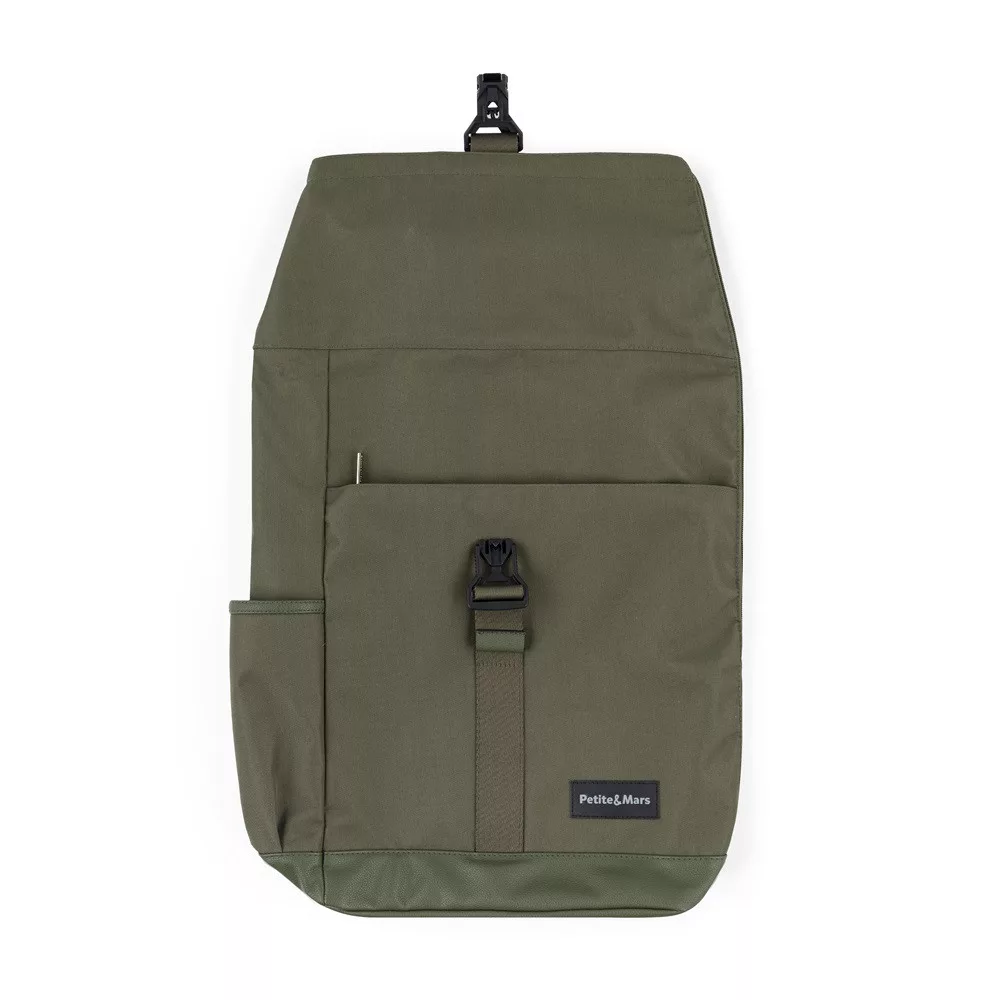 Petite & Mars JACKOB Pelenkázó Hátizsák Babakocsira Military Green - Mágneszáras Roll-Top, 8 Zseb, Laptoprekesz és Vízálló Pelenkázó Alátét