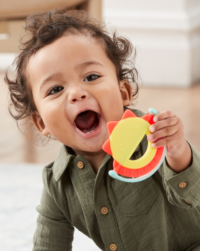 A Skip Hop Silver Lining Nap rágóka aranyos, napocska formájú babarágóka, amely segít az első fogacskák előbújásának időszakában. Puha szilikon anyaga biztonságos és kényelmes a babák számára, textúrái pedig enyhítik a fogzási kellemetlenségeket, miközben játékos élményt nyújtanak. Könnyen megfogható kialakítása mozgó gyűrűt tartalmaz, amelyet a kis kezek örömmel fedeznek fel, így a rágóka egyszerre fejlesztő játék és praktikus fogzási segédeszköz.